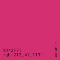 Цвет #D42F71 в цветовой модели RGB обозначается тремя октетами (212, 47, 113) в десятичном формате и #D42F71 в шестнадцатиричном (hex) формате, которые являются интенсивностью красного 212 (hex D4), интенсивность зелёного 47 (hex 2F) и интенсивность синего 113 (hex 71).
