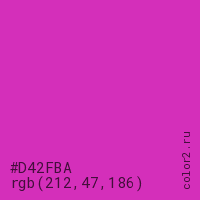 Цвет #D42FBA в цветовой модели RGB обозначается тремя октетами (212, 47, 186) в десятичном формате и #D42FBA в шестнадцатиричном (hex) формате, которые являются интенсивностью красного 212 (hex D4), интенсивность зелёного 47 (hex 2F) и интенсивность синего 186 (hex BA).
