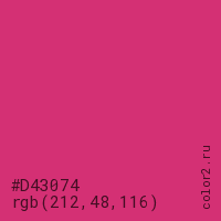 Цвет #D43074 в цветовой модели RGB обозначается тремя октетами (212, 48, 116) в десятичном формате и #D43074 в шестнадцатиричном (hex) формате, которые являются интенсивностью красного 212 (hex D4), интенсивность зелёного 48 (hex 30) и интенсивность синего 116 (hex 74).