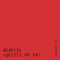 Цвет #D43136 в цветовой модели RGB обозначается тремя октетами (212, 49, 54) в десятичном формате и #D43136 в шестнадцатиричном (hex) формате, которые являются интенсивностью красного 212 (hex D4), интенсивность зелёного 49 (hex 31) и интенсивность синего 54 (hex 36).
