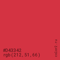 Цвет #D43342 в цветовой модели RGB обозначается тремя октетами (212, 51, 66) в десятичном формате и #D43342 в шестнадцатиричном (hex) формате, которые являются интенсивностью красного 212 (hex D4), интенсивность зелёного 51 (hex 33) и интенсивность синего 66 (hex 42).