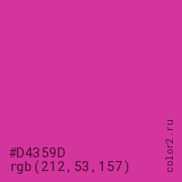 Цвет #D4359D в цветовой модели RGB обозначается тремя октетами (212, 53, 157) в десятичном формате и #D4359D в шестнадцатиричном (hex) формате, которые являются интенсивностью красного 212 (hex D4), интенсивность зелёного 53 (hex 35) и интенсивность синего 157 (hex 9D).