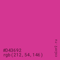 Цвет #D43692 в цветовой модели RGB обозначается тремя октетами (212, 54, 146) в десятичном формате и #D43692 в шестнадцатиричном (hex) формате, которые являются интенсивностью красного 212 (hex D4), интенсивность зелёного 54 (hex 36) и интенсивность синего 146 (hex 92).