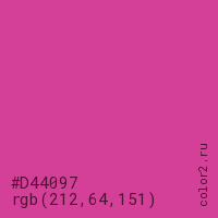 Цвет #D44097 в цветовой модели RGB обозначается тремя октетами (212, 64, 151) в десятичном формате и #D44097 в шестнадцатиричном (hex) формате, которые являются интенсивностью красного 212 (hex D4), интенсивность зелёного 64 (hex 40) и интенсивность синего 151 (hex 97).