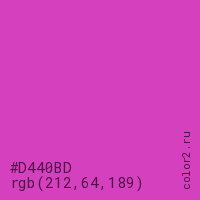 Цвет #D440BD в цветовой модели RGB обозначается тремя октетами (212, 64, 189) в десятичном формате и #D440BD в шестнадцатиричном (hex) формате, которые являются интенсивностью красного 212 (hex D4), интенсивность зелёного 64 (hex 40) и интенсивность синего 189 (hex BD).