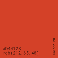 Цвет #D44128 в цветовой модели RGB обозначается тремя октетами (212, 65, 40) в десятичном формате и #D44128 в шестнадцатиричном (hex) формате, которые являются интенсивностью красного 212 (hex D4), интенсивность зелёного 65 (hex 41) и интенсивность синего 40 (hex 28).