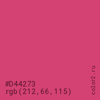 Цвет #D44273 в цветовой модели RGB обозначается тремя октетами (212, 66, 115) в десятичном формате и #D44273 в шестнадцатиричном (hex) формате, которые являются интенсивностью красного 212 (hex D4), интенсивность зелёного 66 (hex 42) и интенсивность синего 115 (hex 73).