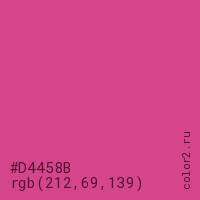 Цвет #D4458B в цветовой модели RGB обозначается тремя октетами (212, 69, 139) в десятичном формате и #D4458B в шестнадцатиричном (hex) формате, которые являются интенсивностью красного 212 (hex D4), интенсивность зелёного 69 (hex 45) и интенсивность синего 139 (hex 8B).