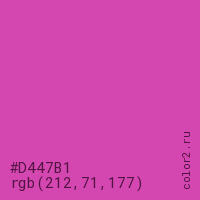 Цвет #D447B1 в цветовой модели RGB обозначается тремя октетами (212, 71, 177) в десятичном формате и #D447B1 в шестнадцатиричном (hex) формате, которые являются интенсивностью красного 212 (hex D4), интенсивность зелёного 71 (hex 47) и интенсивность синего 177 (hex B1).