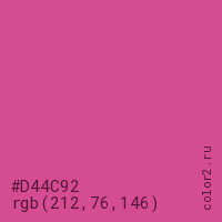 Цвет #D44C92 в цветовой модели RGB обозначается тремя октетами (212, 76, 146) в десятичном формате и #D44C92 в шестнадцатиричном (hex) формате, которые являются интенсивностью красного 212 (hex D4), интенсивность зелёного 76 (hex 4C) и интенсивность синего 146 (hex 92).