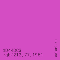 Цвет #D44DC3 в цветовой модели RGB обозначается тремя октетами (212, 77, 195) в десятичном формате и #D44DC3 в шестнадцатиричном (hex) формате, которые являются интенсивностью красного 212 (hex D4), интенсивность зелёного 77 (hex 4D) и интенсивность синего 195 (hex C3).