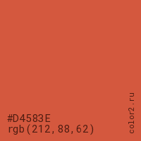 Цвет #D4583E в цветовой модели RGB обозначается тремя октетами (212, 88, 62) в десятичном формате и #D4583E в шестнадцатиричном (hex) формате, которые являются интенсивностью красного 212 (hex D4), интенсивность зелёного 88 (hex 58) и интенсивность синего 62 (hex 3E).