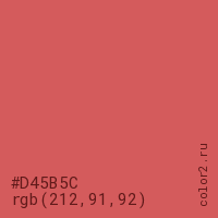 Цвет #D45B5C в цветовой модели RGB обозначается тремя октетами (212, 91, 92) в десятичном формате и #D45B5C в шестнадцатиричном (hex) формате, которые являются интенсивностью красного 212 (hex D4), интенсивность зелёного 91 (hex 5B) и интенсивность синего 92 (hex 5C).