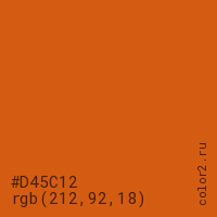Цвет #D45C12 в цветовой модели RGB обозначается тремя октетами (212, 92, 18) в десятичном формате и #D45C12 в шестнадцатиричном (hex) формате, которые являются интенсивностью красного 212 (hex D4), интенсивность зелёного 92 (hex 5C) и интенсивность синего 18 (hex 12).