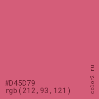 Цвет #D45D79 в цветовой модели RGB обозначается тремя октетами (212, 93, 121) в десятичном формате и #D45D79 в шестнадцатиричном (hex) формате, которые являются интенсивностью красного 212 (hex D4), интенсивность зелёного 93 (hex 5D) и интенсивность синего 121 (hex 79).
