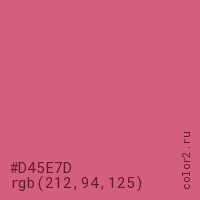 Цвет #D45E7D в цветовой модели RGB обозначается тремя октетами (212, 94, 125) в десятичном формате и #D45E7D в шестнадцатиричном (hex) формате, которые являются интенсивностью красного 212 (hex D4), интенсивность зелёного 94 (hex 5E) и интенсивность синего 125 (hex 7D).