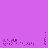 Цвет #D460EB в цветовой модели RGB обозначается тремя октетами (212, 96, 235) в десятичном формате и #D460EB в шестнадцатиричном (hex) формате, которые являются интенсивностью красного 212 (hex D4), интенсивность зелёного 96 (hex 60) и интенсивность синего 235 (hex EB).