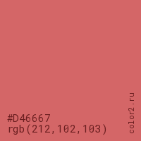 Цвет #D46667 в цветовой модели RGB обозначается тремя октетами (212, 102, 103) в десятичном формате и #D46667 в шестнадцатиричном (hex) формате, которые являются интенсивностью красного 212 (hex D4), интенсивность зелёного 102 (hex 66) и интенсивность синего 103 (hex 67).
