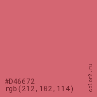 Цвет #D46672 в цветовой модели RGB обозначается тремя октетами (212, 102, 114) в десятичном формате и #D46672 в шестнадцатиричном (hex) формате, которые являются интенсивностью красного 212 (hex D4), интенсивность зелёного 102 (hex 66) и интенсивность синего 114 (hex 72).