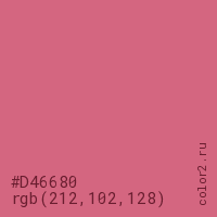 Цвет #D46680 в цветовой модели RGB обозначается тремя октетами (212, 102, 128) в десятичном формате и #D46680 в шестнадцатиричном (hex) формате, которые являются интенсивностью красного 212 (hex D4), интенсивность зелёного 102 (hex 66) и интенсивность синего 128 (hex 80).