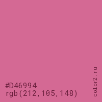 Цвет #D46994 в цветовой модели RGB обозначается тремя октетами (212, 105, 148) в десятичном формате и #D46994 в шестнадцатиричном (hex) формате, которые являются интенсивностью красного 212 (hex D4), интенсивность зелёного 105 (hex 69) и интенсивность синего 148 (hex 94).
