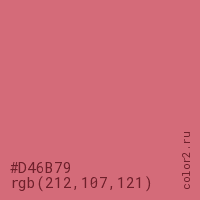 Цвет #D46B79 в цветовой модели RGB обозначается тремя октетами (212, 107, 121) в десятичном формате и #D46B79 в шестнадцатиричном (hex) формате, которые являются интенсивностью красного 212 (hex D4), интенсивность зелёного 107 (hex 6B) и интенсивность синего 121 (hex 79).