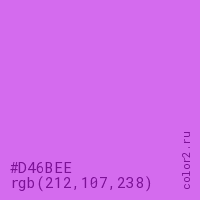 Цвет #D46BEE в цветовой модели RGB обозначается тремя октетами (212, 107, 238) в десятичном формате и #D46BEE в шестнадцатиричном (hex) формате, которые являются интенсивностью красного 212 (hex D4), интенсивность зелёного 107 (hex 6B) и интенсивность синего 238 (hex EE).