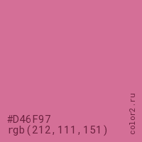 Цвет #D46F97 в цветовой модели RGB обозначается тремя октетами (212, 111, 151) в десятичном формате и #D46F97 в шестнадцатиричном (hex) формате, которые являются интенсивностью красного 212 (hex D4), интенсивность зелёного 111 (hex 6F) и интенсивность синего 151 (hex 97).