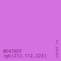 Цвет #D470DF в цветовой модели RGB обозначается тремя октетами (212, 112, 223) в десятичном формате и #D470DF в шестнадцатиричном (hex) формате, которые являются интенсивностью красного 212 (hex D4), интенсивность зелёного 112 (hex 70) и интенсивность синего 223 (hex DF).