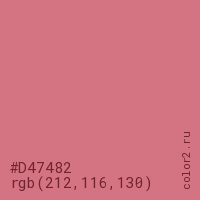 Цвет #D47482 в цветовой модели RGB обозначается тремя октетами (212, 116, 130) в десятичном формате и #D47482 в шестнадцатиричном (hex) формате, которые являются интенсивностью красного 212 (hex D4), интенсивность зелёного 116 (hex 74) и интенсивность синего 130 (hex 82).