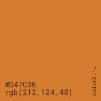 Цвет #D47C30 в цветовой модели RGB обозначается тремя октетами (212, 124, 48) в десятичном формате и #D47C30 в шестнадцатиричном (hex) формате, которые являются интенсивностью красного 212 (hex D4), интенсивность зелёного 124 (hex 7C) и интенсивность синего 48 (hex 30).