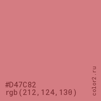 Цвет #D47C82 в цветовой модели RGB обозначается тремя октетами (212, 124, 130) в десятичном формате и #D47C82 в шестнадцатиричном (hex) формате, которые являются интенсивностью красного 212 (hex D4), интенсивность зелёного 124 (hex 7C) и интенсивность синего 130 (hex 82).