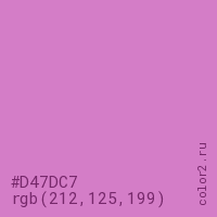 Цвет #D47DC7 в цветовой модели RGB обозначается тремя октетами (212, 125, 199) в десятичном формате и #D47DC7 в шестнадцатиричном (hex) формате, которые являются интенсивностью красного 212 (hex D4), интенсивность зелёного 125 (hex 7D) и интенсивность синего 199 (hex C7).