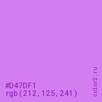 Цвет #D47DF1 в цветовой модели RGB обозначается тремя октетами (212, 125, 241) в десятичном формате и #D47DF1 в шестнадцатиричном (hex) формате, которые являются интенсивностью красного 212 (hex D4), интенсивность зелёного 125 (hex 7D) и интенсивность синего 241 (hex F1).