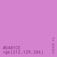 Цвет #D481CE в цветовой модели RGB обозначается тремя октетами (212, 129, 206) в десятичном формате и #D481CE в шестнадцатиричном (hex) формате, которые являются интенсивностью красного 212 (hex D4), интенсивность зелёного 129 (hex 81) и интенсивность синего 206 (hex CE).