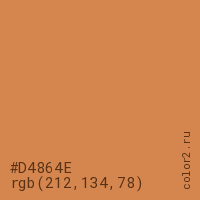 Цвет #D4864E в цветовой модели RGB обозначается тремя октетами (212, 134, 78) в десятичном формате и #D4864E в шестнадцатиричном (hex) формате, которые являются интенсивностью красного 212 (hex D4), интенсивность зелёного 134 (hex 86) и интенсивность синего 78 (hex 4E).