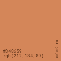 Цвет #D48659 в цветовой модели RGB обозначается тремя октетами (212, 134, 89) в десятичном формате и #D48659 в шестнадцатиричном (hex) формате, которые являются интенсивностью красного 212 (hex D4), интенсивность зелёного 134 (hex 86) и интенсивность синего 89 (hex 59).