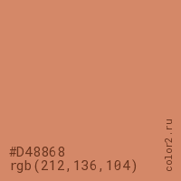Цвет #D48868 в цветовой модели RGB обозначается тремя октетами (212, 136, 104) в десятичном формате и #D48868 в шестнадцатиричном (hex) формате, которые являются интенсивностью красного 212 (hex D4), интенсивность зелёного 136 (hex 88) и интенсивность синего 104 (hex 68).