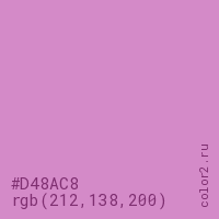 Цвет #D48AC8 в цветовой модели RGB обозначается тремя октетами (212, 138, 200) в десятичном формате и #D48AC8 в шестнадцатиричном (hex) формате, которые являются интенсивностью красного 212 (hex D4), интенсивность зелёного 138 (hex 8A) и интенсивность синего 200 (hex C8).
