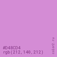 Цвет #D48CD4 в цветовой модели RGB обозначается тремя октетами (212, 140, 212) в десятичном формате и #D48CD4 в шестнадцатиричном (hex) формате, которые являются интенсивностью красного 212 (hex D4), интенсивность зелёного 140 (hex 8C) и интенсивность синего 212 (hex D4).