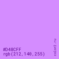 Цвет #D48CFF в цветовой модели RGB обозначается тремя октетами (212, 140, 255) в десятичном формате и #D48CFF в шестнадцатиричном (hex) формате, которые являются интенсивностью красного 212 (hex D4), интенсивность зелёного 140 (hex 8C) и интенсивность синего 255 (hex FF).