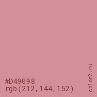 Цвет #D49098 в цветовой модели RGB обозначается тремя октетами (212, 144, 152) в десятичном формате и #D49098 в шестнадцатиричном (hex) формате, которые являются интенсивностью красного 212 (hex D4), интенсивность зелёного 144 (hex 90) и интенсивность синего 152 (hex 98).