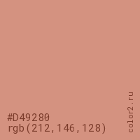 Цвет #D49280 в цветовой модели RGB обозначается тремя октетами (212, 146, 128) в десятичном формате и #D49280 в шестнадцатиричном (hex) формате, которые являются интенсивностью красного 212 (hex D4), интенсивность зелёного 146 (hex 92) и интенсивность синего 128 (hex 80).