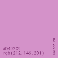 Цвет #D492C9 в цветовой модели RGB обозначается тремя октетами (212, 146, 201) в десятичном формате и #D492C9 в шестнадцатиричном (hex) формате, которые являются интенсивностью красного 212 (hex D4), интенсивность зелёного 146 (hex 92) и интенсивность синего 201 (hex C9).