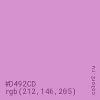 Цвет #D492CD в цветовой модели RGB обозначается тремя октетами (212, 146, 205) в десятичном формате и #D492CD в шестнадцатиричном (hex) формате, которые являются интенсивностью красного 212 (hex D4), интенсивность зелёного 146 (hex 92) и интенсивность синего 205 (hex CD).