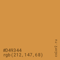 Цвет #D49344 в цветовой модели RGB обозначается тремя октетами (212, 147, 68) в десятичном формате и #D49344 в шестнадцатиричном (hex) формате, которые являются интенсивностью красного 212 (hex D4), интенсивность зелёного 147 (hex 93) и интенсивность синего 68 (hex 44).