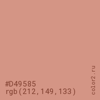 Цвет #D49585 в цветовой модели RGB обозначается тремя октетами (212, 149, 133) в десятичном формате и #D49585 в шестнадцатиричном (hex) формате, которые являются интенсивностью красного 212 (hex D4), интенсивность зелёного 149 (hex 95) и интенсивность синего 133 (hex 85).