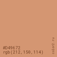 Цвет #D49672 в цветовой модели RGB обозначается тремя октетами (212, 150, 114) в десятичном формате и #D49672 в шестнадцатиричном (hex) формате, которые являются интенсивностью красного 212 (hex D4), интенсивность зелёного 150 (hex 96) и интенсивность синего 114 (hex 72).