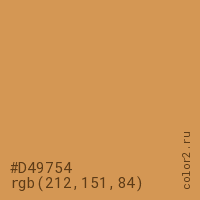 Цвет #D49754 в цветовой модели RGB обозначается тремя октетами (212, 151, 84) в десятичном формате и #D49754 в шестнадцатиричном (hex) формате, которые являются интенсивностью красного 212 (hex D4), интенсивность зелёного 151 (hex 97) и интенсивность синего 84 (hex 54).