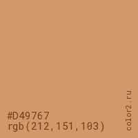 Цвет #D49767 в цветовой модели RGB обозначается тремя октетами (212, 151, 103) в десятичном формате и #D49767 в шестнадцатиричном (hex) формате, которые являются интенсивностью красного 212 (hex D4), интенсивность зелёного 151 (hex 97) и интенсивность синего 103 (hex 67).